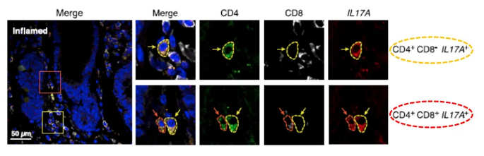 除了炎癥相關(guān)成纖維細胞外,單細胞測序分析結(jié)果也表明在UC患者樣本中,同時表達CD8和IL-17的T細胞所占比例更高。在進一步的RNAscope原位雜交驗證中發(fā)現(xiàn)CD4+與CD4- T細胞都共表達CD8與IL17A(見下圖,紅色為RNAscope檢測到的IL17A的RNA信號)。其中CD4+ CD8+IL17A+ T細胞是一類新發(fā)現(xiàn)的細胞亞群,在炎癥組織中,CD4+ CD8+IL17A+ T細胞的數(shù)量明顯增加。