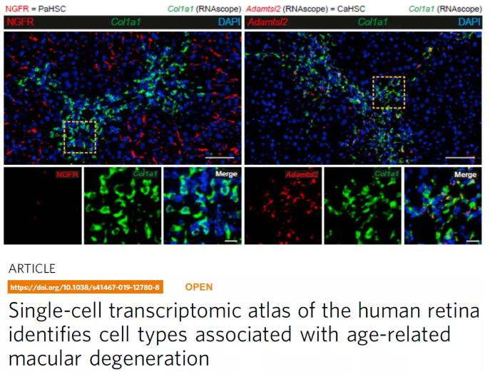急性CCL4誘導(dǎo)的肝損傷的特征是HSCs顯著增值以及被激活為肝小葉中心區(qū)域產(chǎn)生膠原的肌成纖維細胞。為了進一步研究PaHSCs和CaHSCs分化為致病性膠原產(chǎn)生細胞的動態(tài),研究人員利用單細胞測序分析了急性CCL4誘導(dǎo)的肝損傷小鼠模型的HSCs。結(jié)果表明PaHSCs和CaHSCs兩個細胞亞群均表達細胞增殖標(biāo)志物ki67,而只有CaHSCs中纖維化相關(guān)的基因表達顯著升高。利用RNAscope原位雜交結(jié)合免疫熒光證實了CaHSCs是在肝小葉中心性損傷導(dǎo)致的纖維化過程中產(chǎn)生病原膠質(zhì)的主要細胞(見下圖,左圖紅色為RNAscope檢測到的NGFR的RNA信號,右圖紅色為RNAscope檢測到的Adamtsl2的RNA信號)。