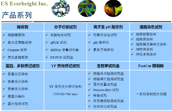 UE公司簡(jiǎn)介:US Everbright? Inc.是一家由原Life technology Inc. 和Biotium Inc.兩家國(guó)際知名生物試劑公司的研發(fā)人員在美國(guó)創(chuàng)立的技術(shù)開(kāi)發(fā)導(dǎo)向型企業(yè)。US Everbright? Inc.秉持“一流世界產(chǎn)品,一流專業(yè)服務(wù)”的宗旨,致力于為生命科學(xué)領(lǐng)域科研工作者提供最卓越的產(chǎn)品和最貼心的服務(wù)。
