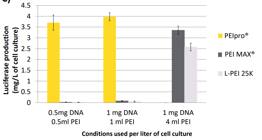 與其他PEI相比,PEIpro?所需試劑較少,DNA用量也較低。將HEK-293懸浮細(xì)胞以1 × 106/ml的濃度接種于無血清培養(yǎng)基中,用PEIpro?、PEI MAX?和L-PEI 25 kDa轉(zhuǎn)染。轉(zhuǎn)染48 h后用常規(guī)熒光素酶法檢測(cè)熒光素酶的表達(dá)。